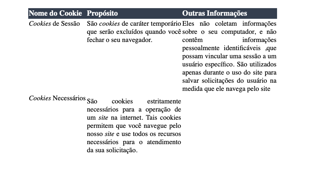 Ao acessar o conteúdo do nosso site poderão ser coletados cookies pelo navegador de maneira temporária, onde tais cookies serão utilizados para melhorar o uso e a funcionalidade do nosso site. Desta forma, quando você utiliza o nosso site para navegar em nossos serviços e visualiza as informações que disponibilizamos vários cookies são usados por nós e por terceiros, permitindo que o nosso site funcione bem e colete informações úteis sobre os visitantes, a fim de tornar a sua experiência de usuário melhor.